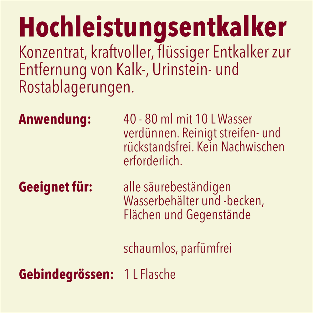 Der Entkalker ist farblos, geruchlos, stark konzentriert und sofort einsatzbereit – einfach auftragen, kurz einwirken lassen und gründlich nachspülen.